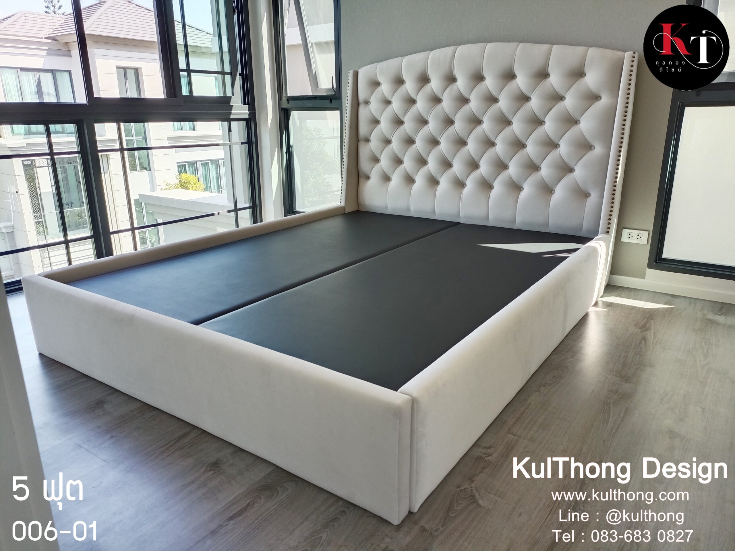 เตียงขนาด 5 ฟุตหุ้มผ้ามีหัวเตียง หุ้มผ้ากำมะหยี่ 006-01 ผ้ากำมะหยี่สีขาว ทำให้เตียงนอนมีพรีเมี่ยม หรูหรา