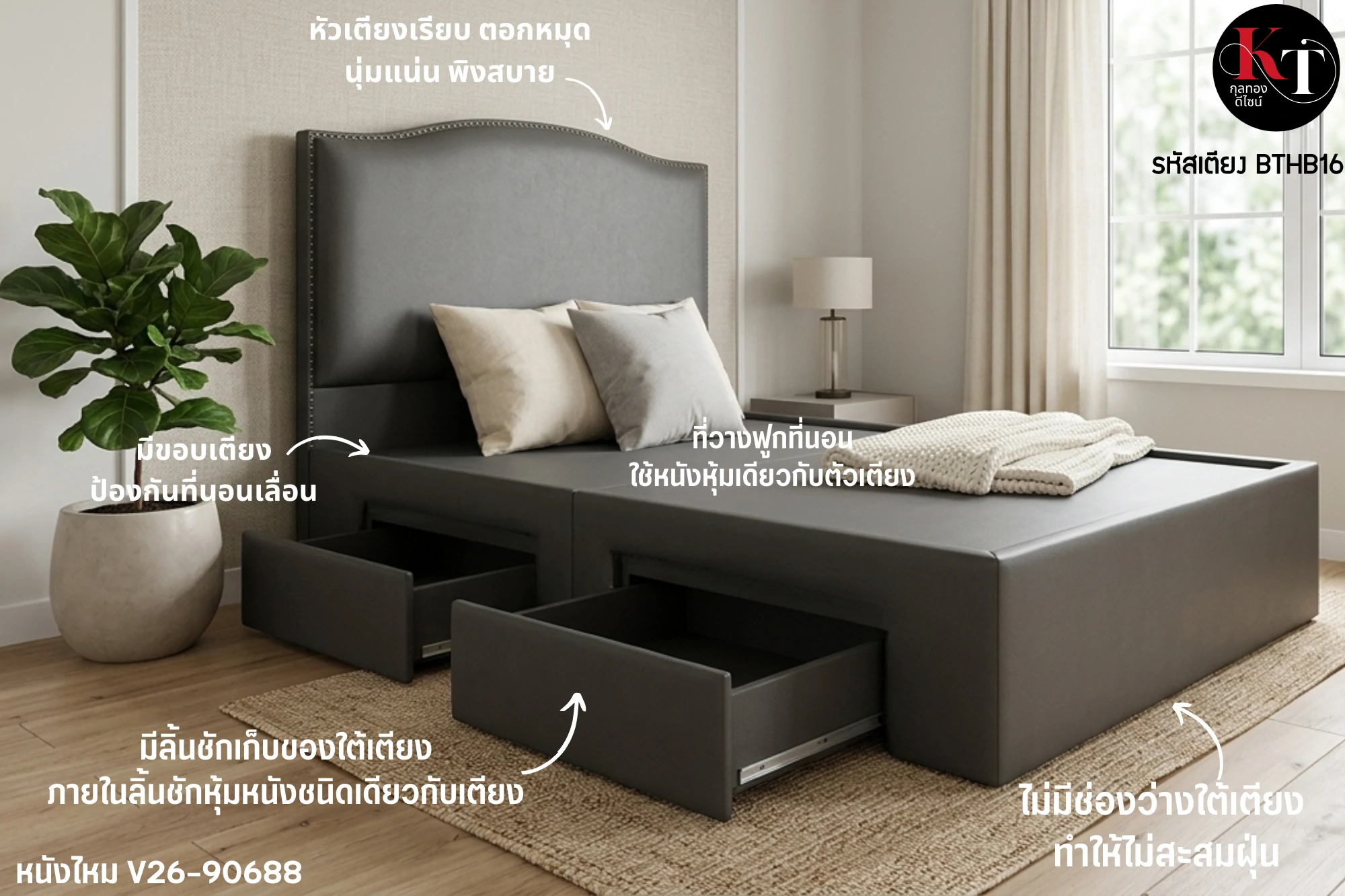 เตียงนอนมีลิ้นชักหุ้มหนังมีหัวเตียง ฐานเตียง มีความสูง 30 เซนติเมตร. กว้าง 117 เซนติเมตร. ยาว 215 เซนติเมตร. หัวเตียงสูง 120 เซนติเมตร.