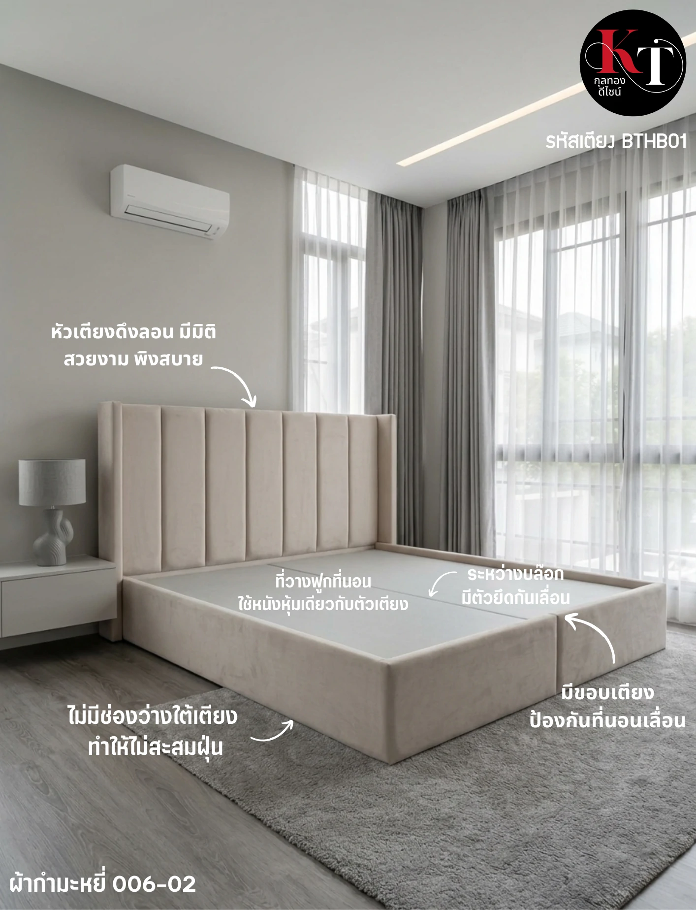 เป็น ฐานเตียง ที่มุ่งเน้นความหรูหรา นิยมมากในงานโครงการ บ้าน คอนโดมิเนียม อพาร์ทเมนท์ วัสดุที่ใช้เน้นวัสดุที่มีคุณภาพ แข็งแรงทนทาน วัสดุหุ้มมีให้เลือกหลายแบบหลายสี